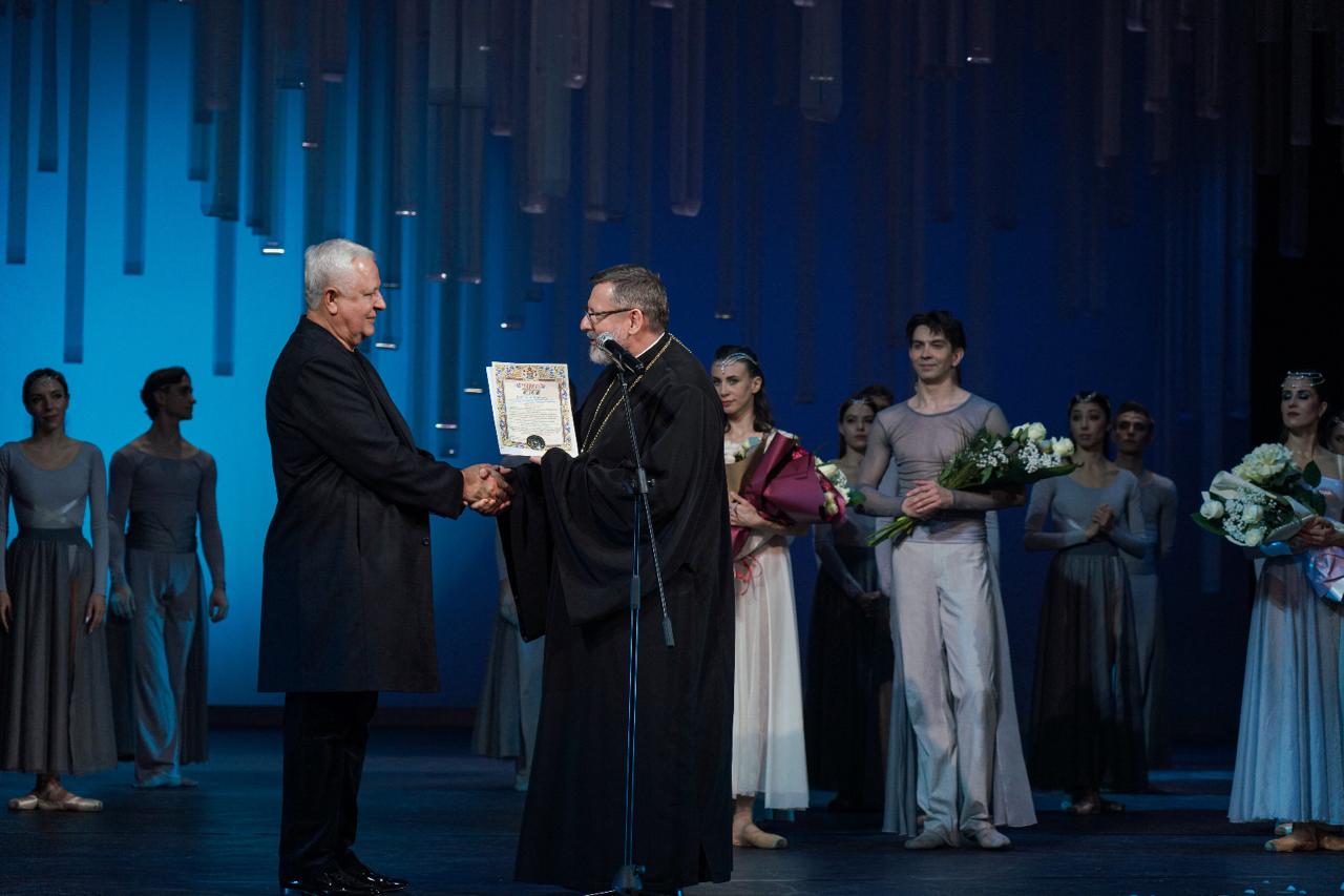 Відтак Блаженніший Святослав звернувся до генерального директора та художнього керівника театру Василя Вовкуна і вручив йому Патріаршу грамоту, адресовану всьому колективу Львівської опери.