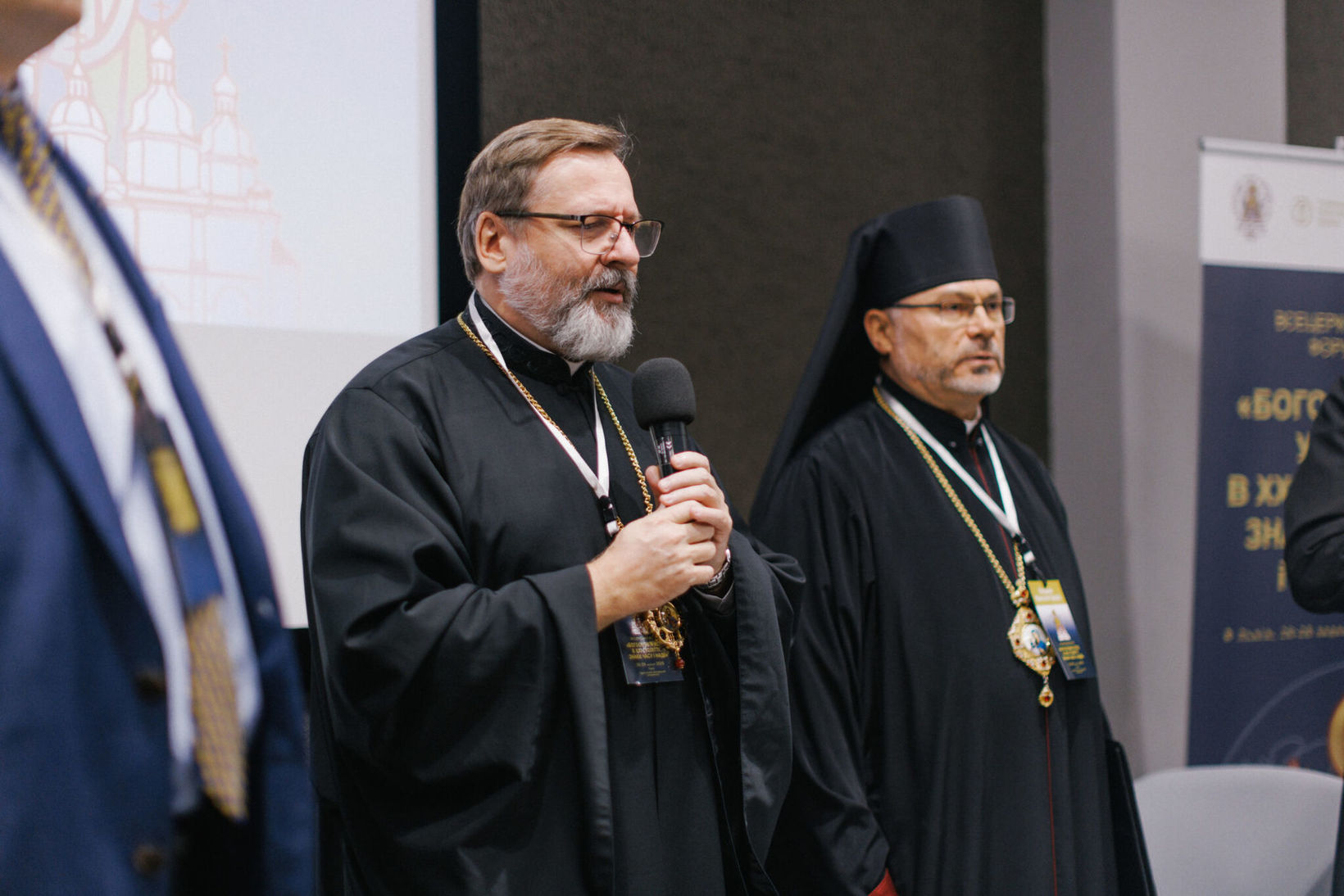 Насамкінець виступу Блаженніший Святослав згадав про знайомство з військовослужбовцем Артуром Дронем та зацитував частину його есею «Господь окопний» з книги «Гемінґвей нічого не знає» — про те, де є Бог на війні: «„Коли священник одягає камуфляж, бере замість автомата стару зашуровану Біблію та їде під обстріли, щоб помолитися з тими, хто хоче разом помолитися — це говорить про Церкву більше, ніж папи римські чи патріархи московські. Коли чоловік на межі зриву отримує лист із дитячим малюнком і втирає сльози — це в ньому стільки Бога проявляється, що й не осягнути. Так, ми віримо, що Господь усе може й усіх любить, але Він досі не зупинив у секунду все це жахіття. Чому? Я теж хочу почути відповідь. Колись я точно Його запитаю. Чому сам не зупинив війну, якщо такий всемогутній. Я матиму багато незручних питань. Але точно не спитаю, де Він був, де був Бог під час війни. Якраз це я знаю. Бачив і відчував. Він був з нами в кожній ямці та під кожним обстрілом. Наш окопний Господь, до якого ми маємо стільки претензій та запитань, із нами обстріляний, з нами втомлений… Інколи стає вже так невимовно важко, такий вже край. А тоді раптом з’являється думка, що я — у найбільш правильному місці на цілу планету, на весь сотворений час і простір. І я маю зараз бути тільки тут. Який чудовий досвід існування“. Дорогі колеги-богослови, — звернувся Блаженніший до гостей форуму. — Я хочу вам побажати мати не нижчий рівень богословʼя, яке ми чуємо від просто хлопця, якому 24 років. Хочу вам побажати мати те саме відчуття, що ви знаходитеся у найбільш правильному місці. Церква вас потребує — вашої творчості, вашого богослов’я, богомислія, бо це є знаки часу і надії для України, і з України для світу».