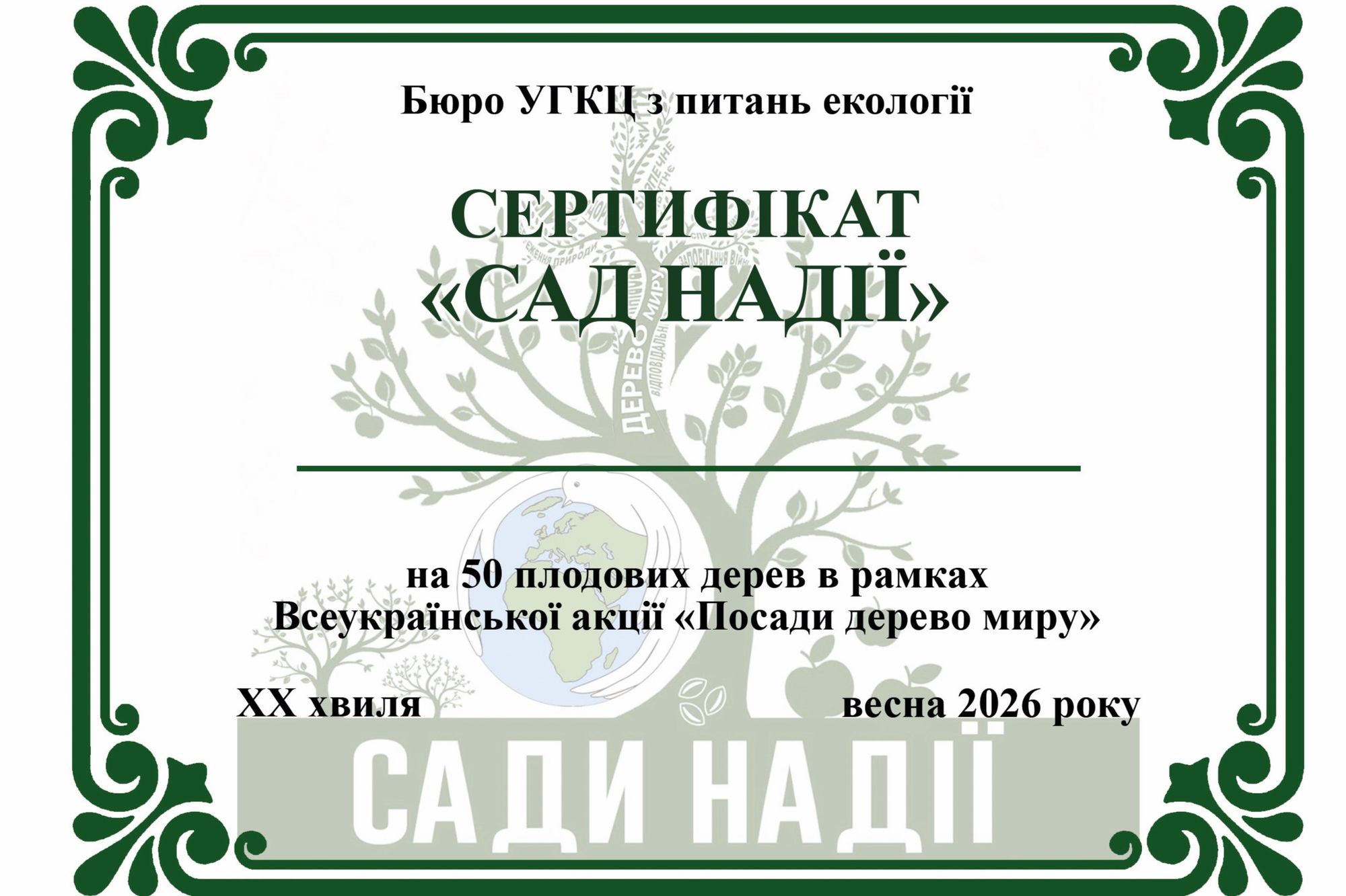 - закласти Сад Надії (не менше 10 саджанців плодових дерев) і зробити допис у соцмережах про участь в акції з хештегом #СадиНадії та розмістити скріншот допису в коментарях під постом акції на фейсбук сторінці Екобюро УГКЦ не пізніше 25 листопада 2025 р.