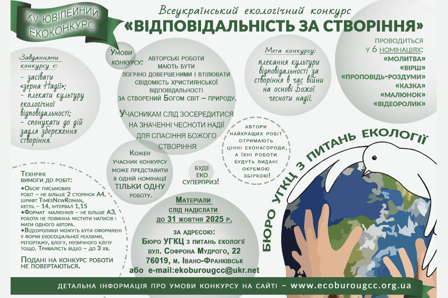 Бюро УГКЦ із питань екології оголошує XV Всеукраїнський екологічний конкурс «Відповідальність за створіння», який цьогоріч присвячений темі «Екологічне покликання в контексті Ювілейного року та Божої чесноти надії». Конкурс має на меті сприяти усвідомленню особистого екологічного покликання та плекати в час війни культуру відповідальності за створіння на основі Божої чесноти надії.
