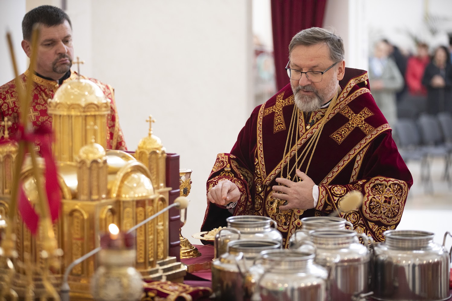 На початку богослужіння Предстоятель освятив антимінси, необхідні для звершення Божественної Літургії, а також миро, яке буде передане по всій Церкві. Наприкінці Літургії відбувся Чин омивання ніг, під час якого Блаженніший Святослав омив ноги священникам Київської архиєпархії, зокрема тим, які здійснюють служіння як військові та медичні капелани.