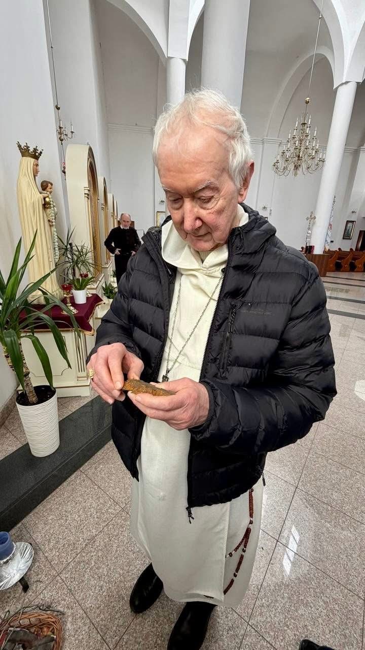 Після спільної молитви монахи показали кардиналові осколки від мін і снарядів, які зібрали на території монастиря: «Ці уламки є мовчазними свідками війни, яка не раз торкалася монастирського подвір’я, однак сама обитель дивом залишилася неушкодженою».