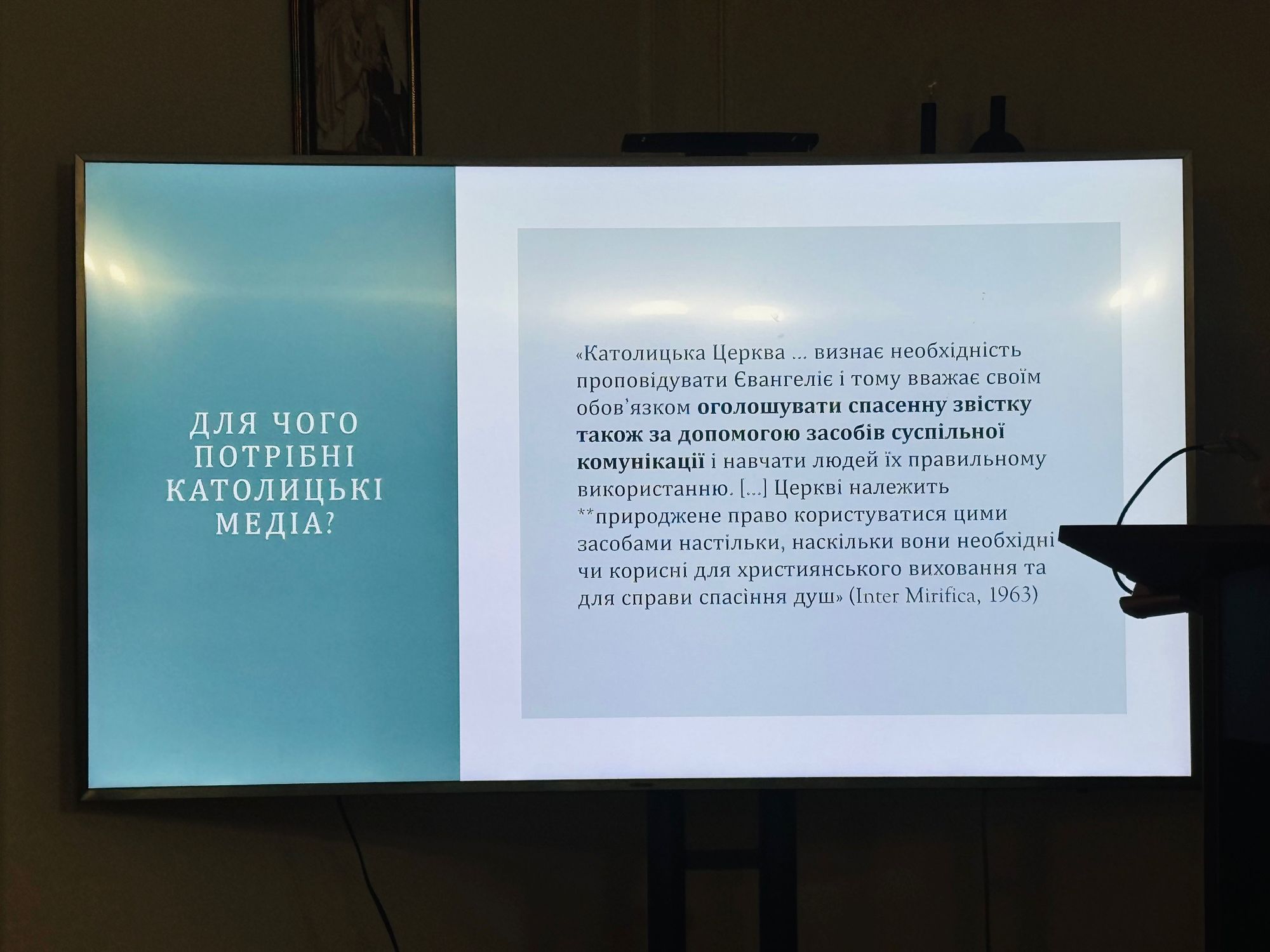Мар’яна Карапінка зупинила свою увагу на католицькому медійному голосі. Покликаючись на Декрет Другого Ватиканського Собору «Inter mirifica», вона зазначила, що «журналістська відповідальність — це говорити правду, поважати гідність, будувати спільноту, пропонувати аудиторії цілісну, а не уривчасту картину світу, плекати почуття краси, служити тому, що церковне вчення називає цивілізацією любові».