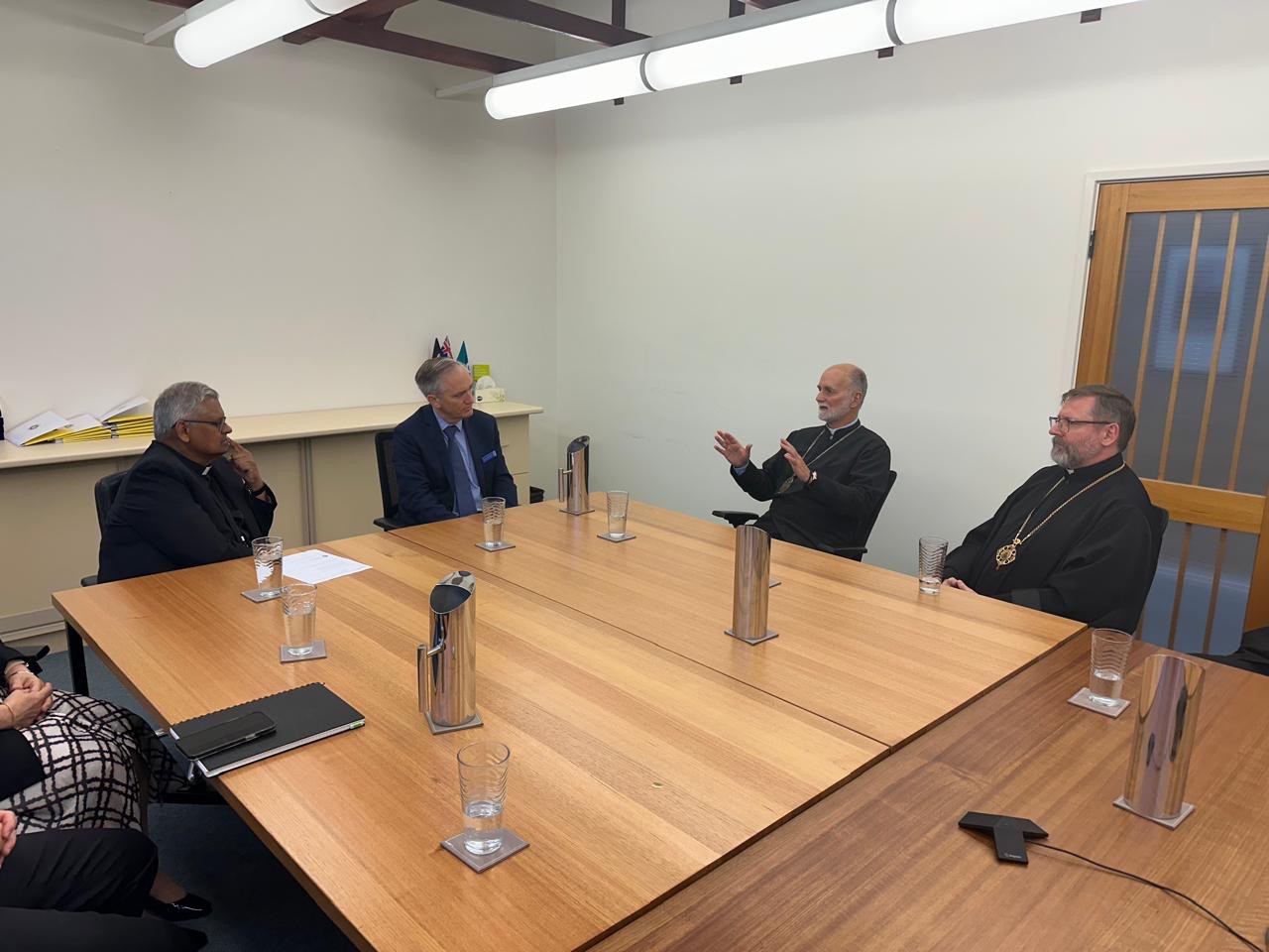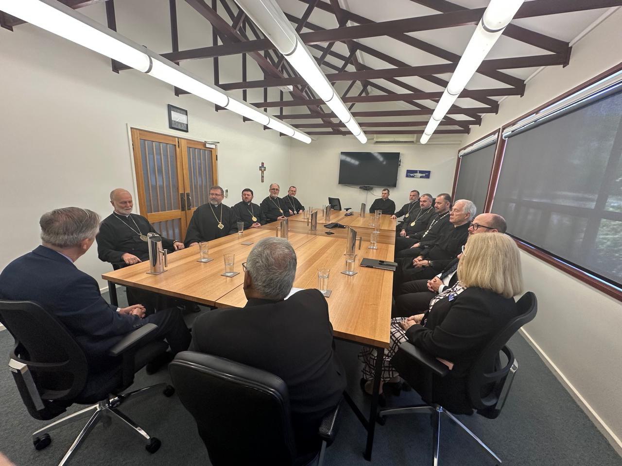9 грудня у столиці Австралії м. Канберра єпископи-члени Постійного Синоду УГКЦ на чолі з Блаженнішим Святославом, Отцем і Главою Української Греко-Католицької Церкви, відвідали адміністративні приміщення Конференції католицьких єпископів Австралії, де зустрілися зі Секретарем цієї конференції о. Крісом де С’юза та представниками різних комісій.