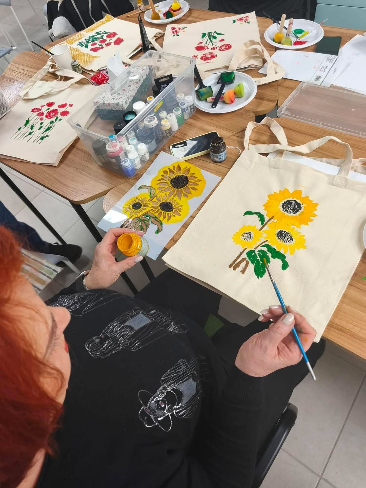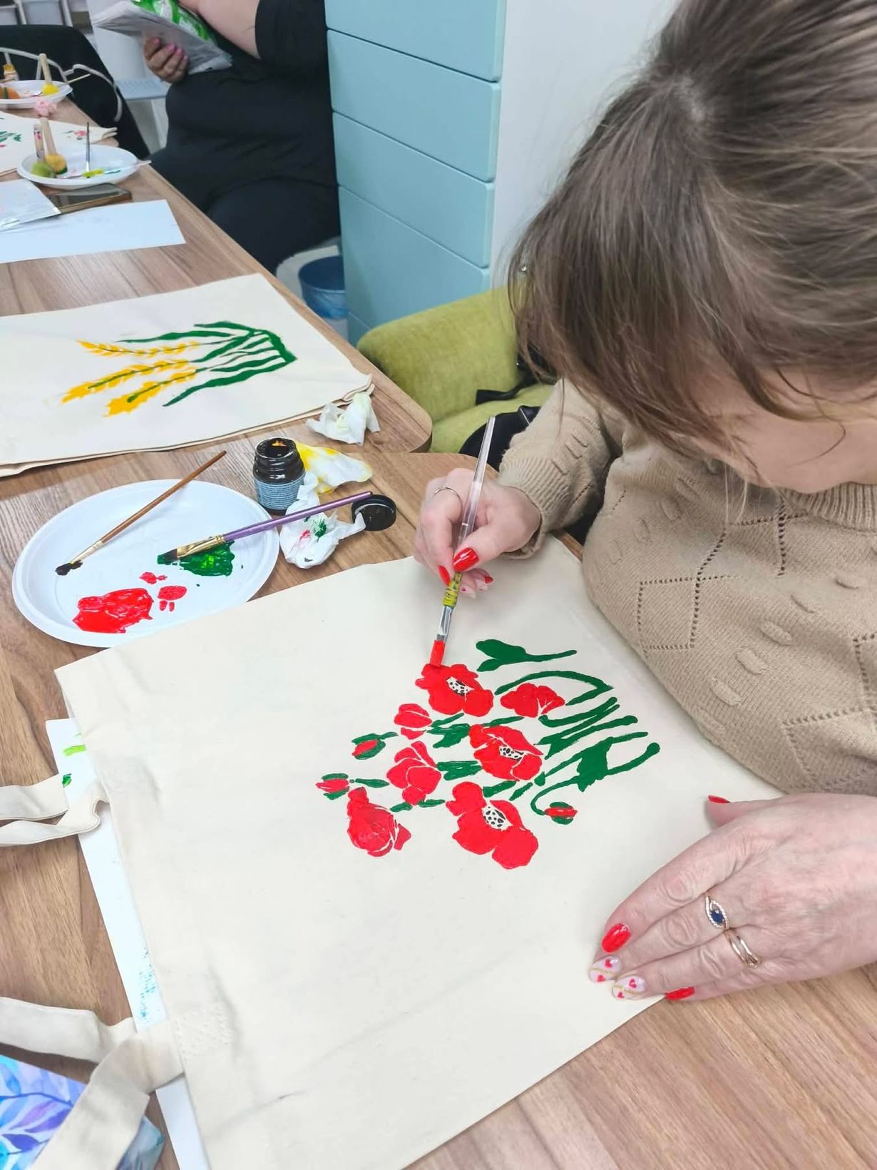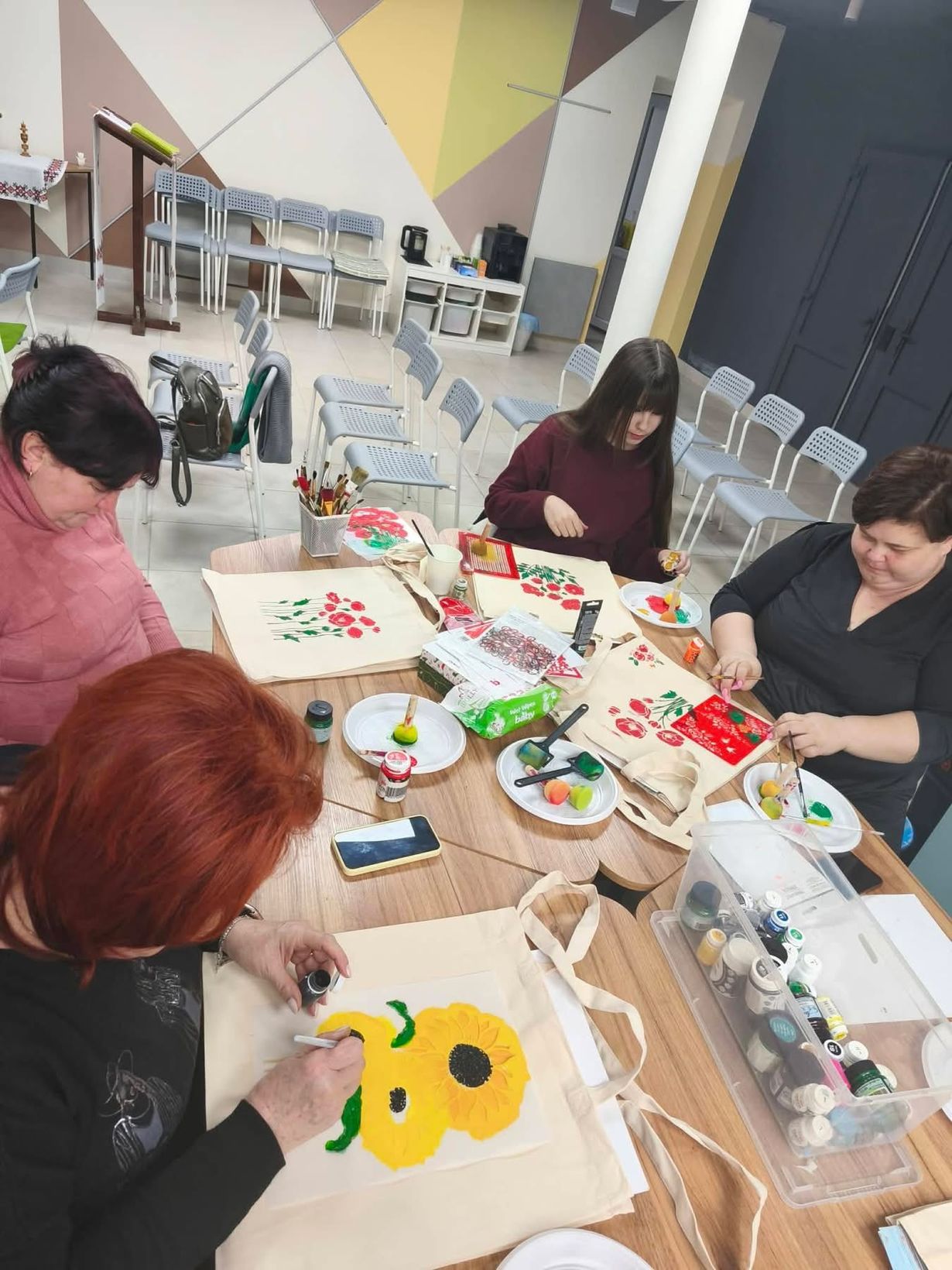 Далі відбулася творча частина зустрічі — разом із майстринями Оленою Ящук та Іриною Юрченко учасниці виготовляли аксесуари — шопери та чохли для окулярів.
