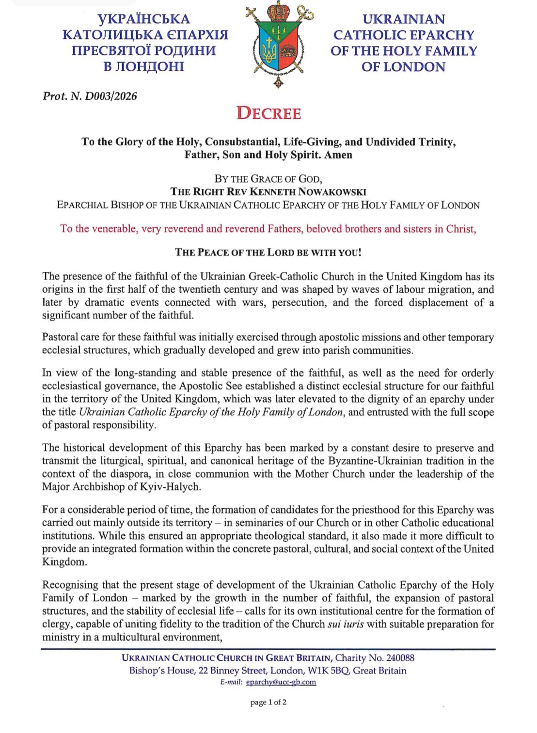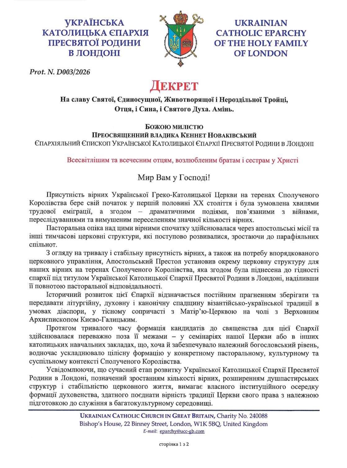 У декреті єпарха зазначається, що присутність вірних Української Греко-Католицької Церкви у Великій Британії почалася в першій половині ХХ століття завдяки хвилям трудової еміграції та подіям війни і переслідувань, що спричинили переселення значної кількості українців. Спершу духовна опіка здійснювалася через апостольські місії та тимчасові церковні структури, які згодом перетворилися на парафіяльні спільноти.