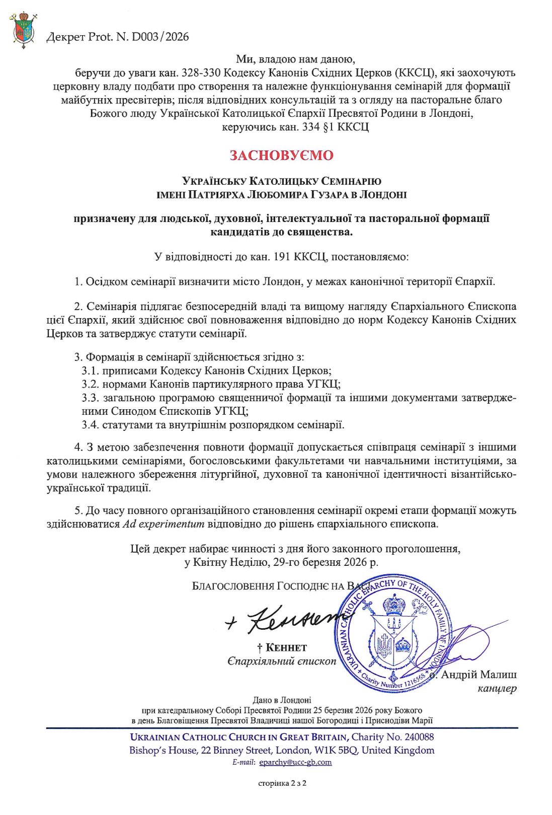 26 березня владика Кеннет Новаківський, єпископ Лондонської єпархії Пресвятої Родини, оголосив про заснування Української Католицької семінарії імені Патріярха Любомира Гузара в Лондоні (Велика Британія).