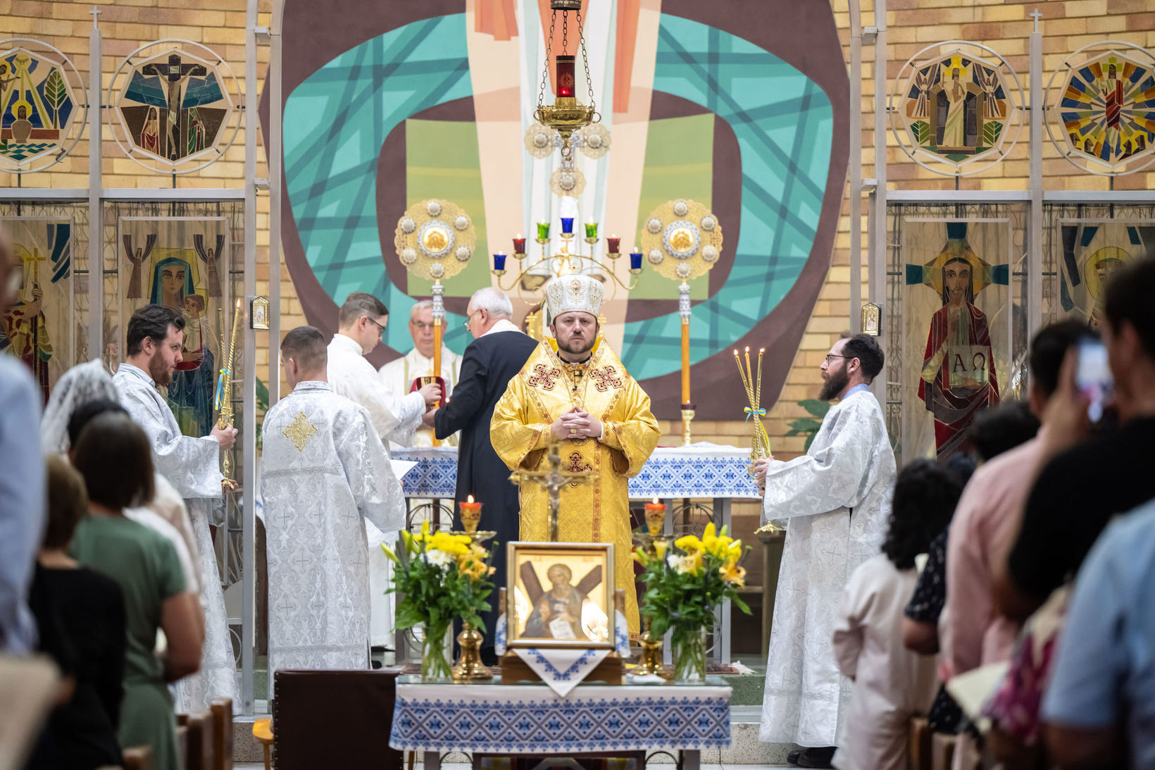 The Divine Liturgy was presided over by His Eminence Mykola Cardinal Bychok, Eparch of Melbourne, concelebrated by Bishop Richard Umbers, Auxiliary Bishop of the Archdiocese of Sydney, Fr. Iurii Tychenok, administrator of St. Andrew’s Parish, and numerous local clergy. Fr. Vasyl Motrichenko, administrator of St. Volodymyr’s Parish in Canberra, also attended the celebration.